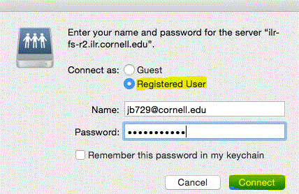 You'll be prompted for your logon credentials. Ensure Registered User is selected. Enter netid@cornell.edu for the username and your netid/email password -> choose Connect. The folder you entered into the server address will pop-up in front of you shortly after Connect has been selected.